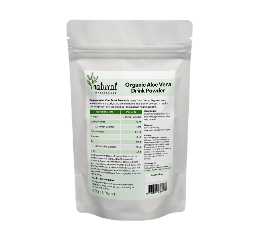 Organic Aloe Vera Drink Powder is made from filleted aloe vera leaves which are dried and concentrated into a drink powder. It retains the long chain polysaccharides for maximum health benefits.